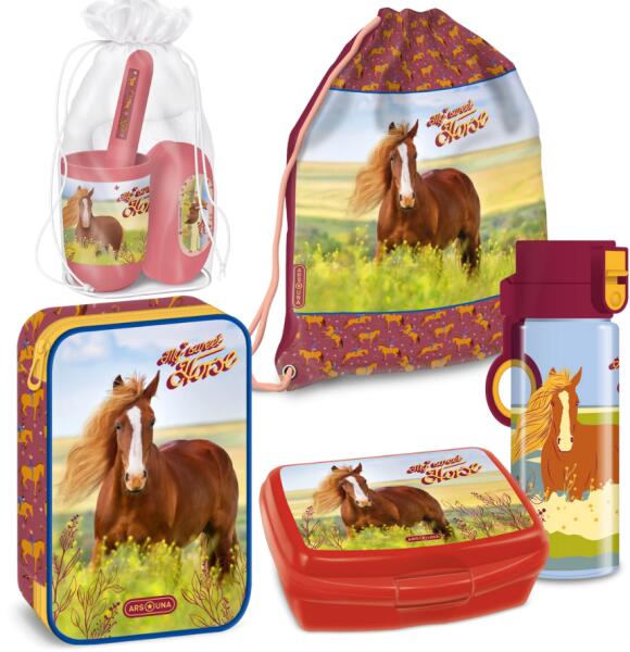 Lovas iskolai csomag – My Sweet Horse kollekció Készülj stílusosan és praktikusan az iskolára ezzel a gyönyörű, lovas témájú csomaggal! Az Ars Una My Sweet Horse kollekció minden eleme harmonizáló designnal és kiváló minőségű, gyermekbarát anyagokkal készült, így tökéletes választás lórajongó kislányok számára. A csomag tartalma: