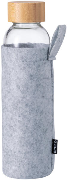Üveg kulacs bambusz kupakkal és RPET filc tasakkal, 500 ml. Nem alkalmas szénsavas italok tárolására.