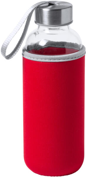 Üveg kulacs hordszíjjal és színes neoprén borítással. 420 ml. Nem alkalmas szénsavas italok tárolására.