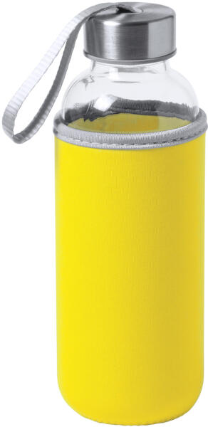 Üveg kulacs hordszíjjal és színes neoprén borítással. 420 ml. Nem alkalmas szénsavas italok tárolására.