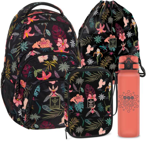 Ars Una Tahiti iskolai szett – 4 részes kollekció tinédzsereknek A Tahiti kollekció friss trópusi mintájával és pasztell színvilágával igazi stílusélményt kínál minden felsős vagy középiskolás lánynak. A praktikus és egymáshoz illő darabok nemcsak szemet gyönyörködtetőek, hanem kiváló minőségűek és kényelmesek is a napi használathoz. A szett tartalma: